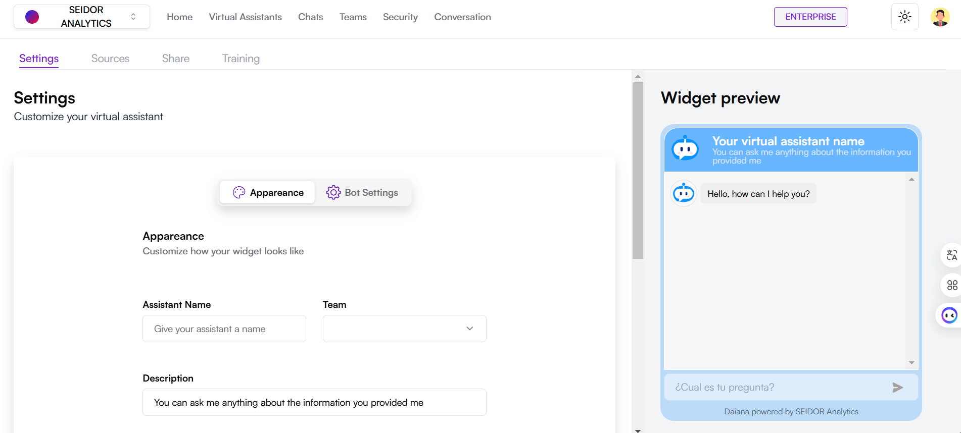 - Preview: Right panel showing a real-time preview of how the virtual assistant and chat will look.