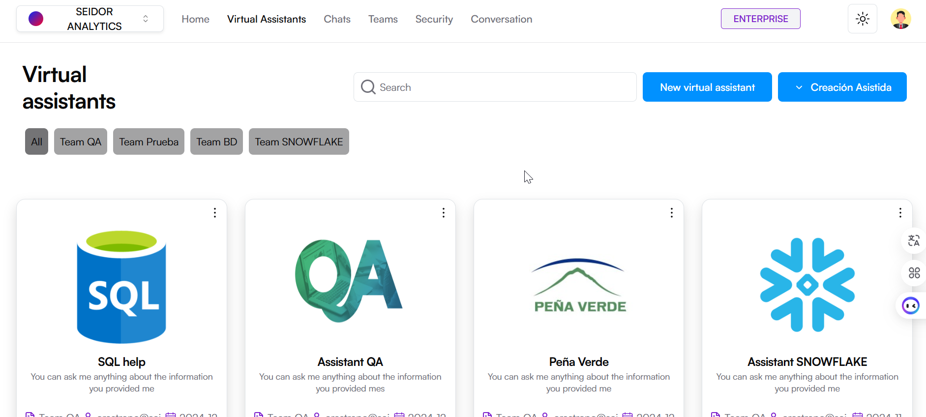The Virtual Assistants screen in Seidor Analytics allows users to view, search, and manage the virtual assistants available on the platform. This screen offers a card view of virtual assistants, each providing key information and direct access to specific functionalities.