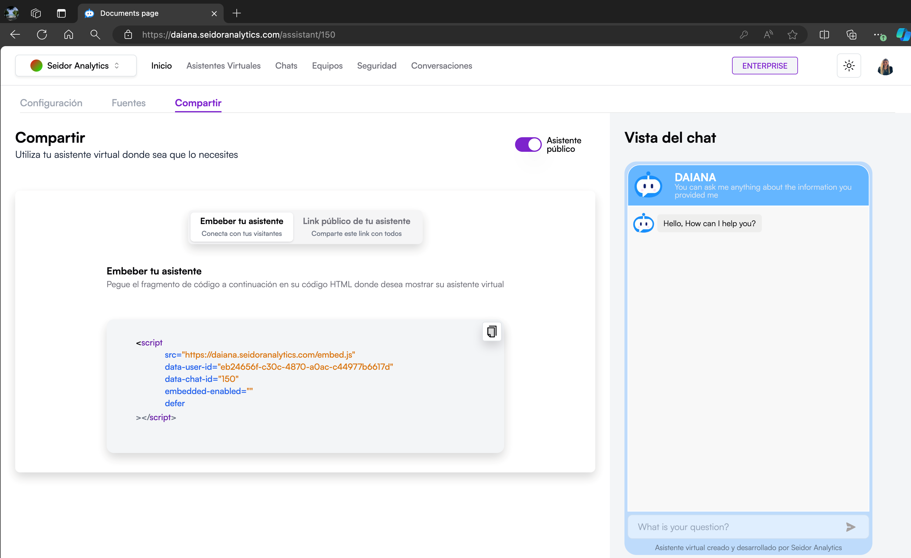 - Public Assistant: Switch to activate or deactivate public visibility of the virtual assistant. When activated, anyone with the public link can access the assistant.