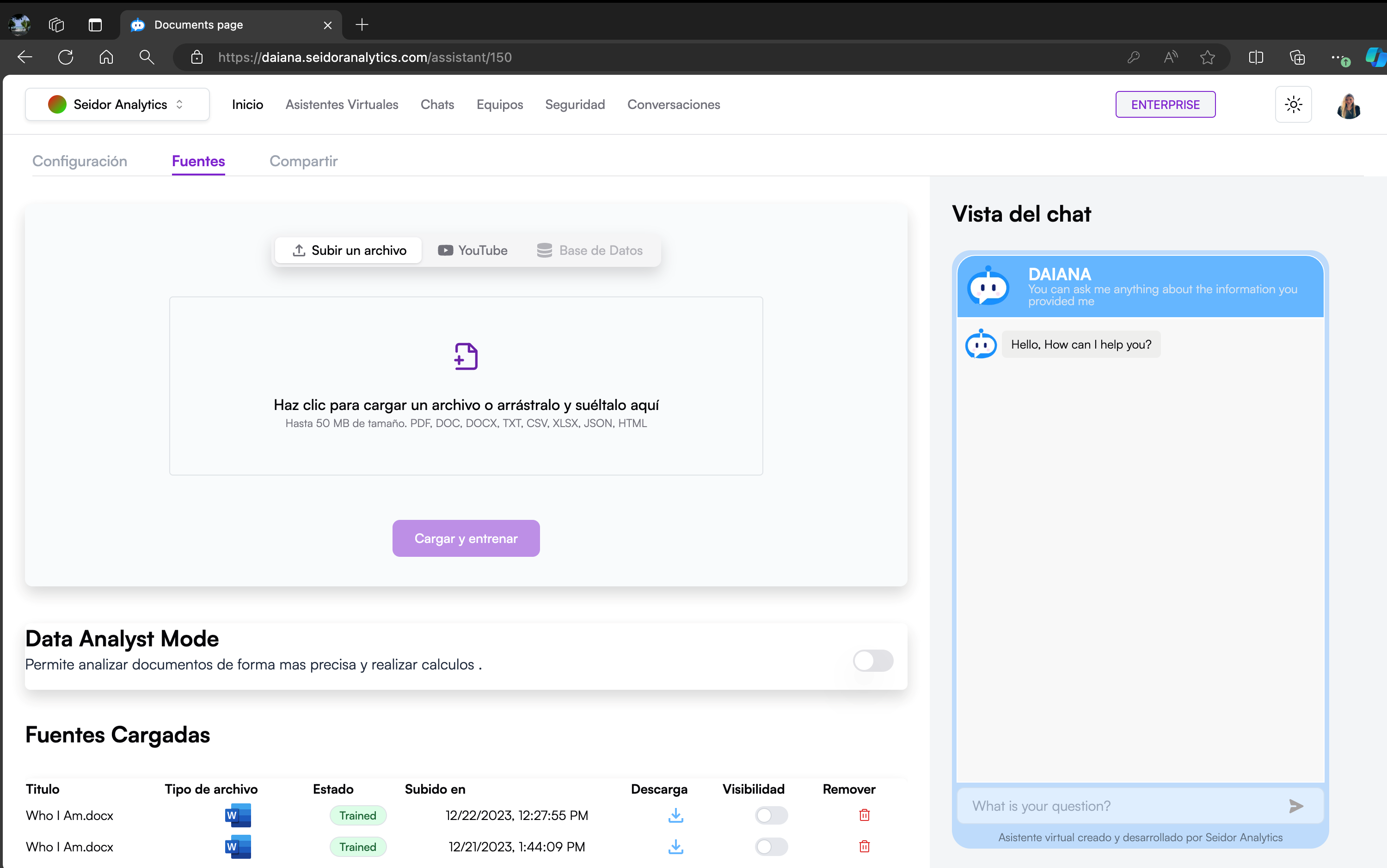 The Sources screen in Seidor Analytics allows users to upload, train, and manage information sources that virtual assistants will use to answer questions and provide support. This screen includes options to upload files, activate data analysis mode, and view already uploaded sources.