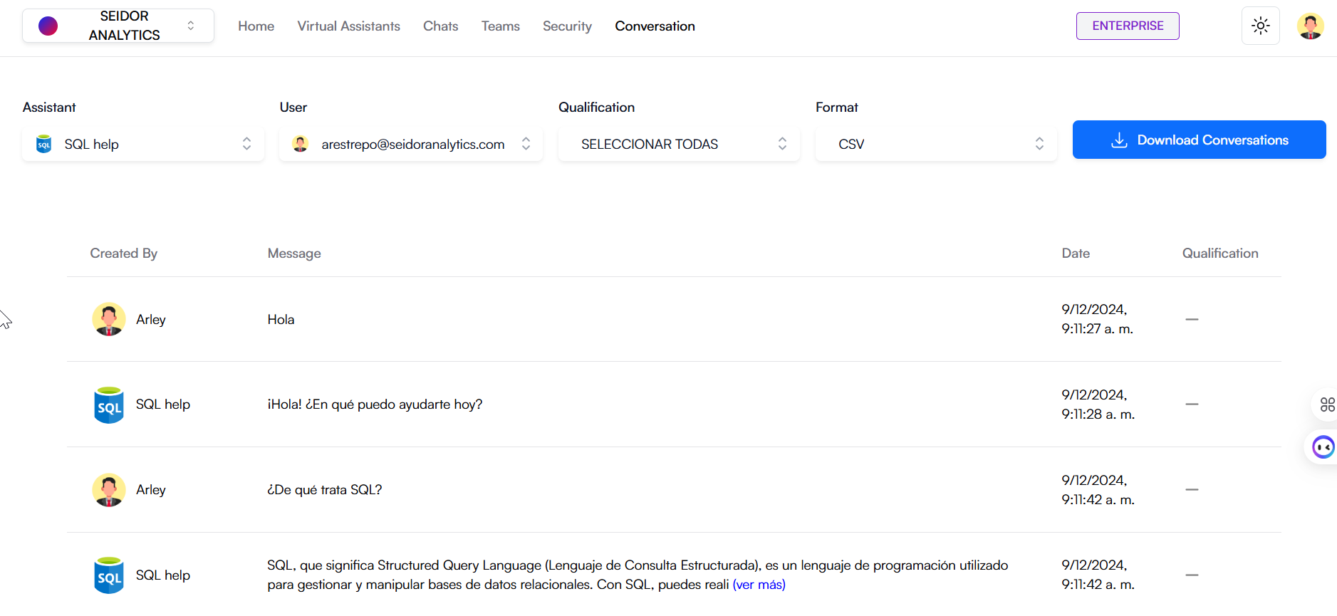 - Selected Assistant: Dropdown allowing selection of the virtual assistant whose conversation you wish to review.