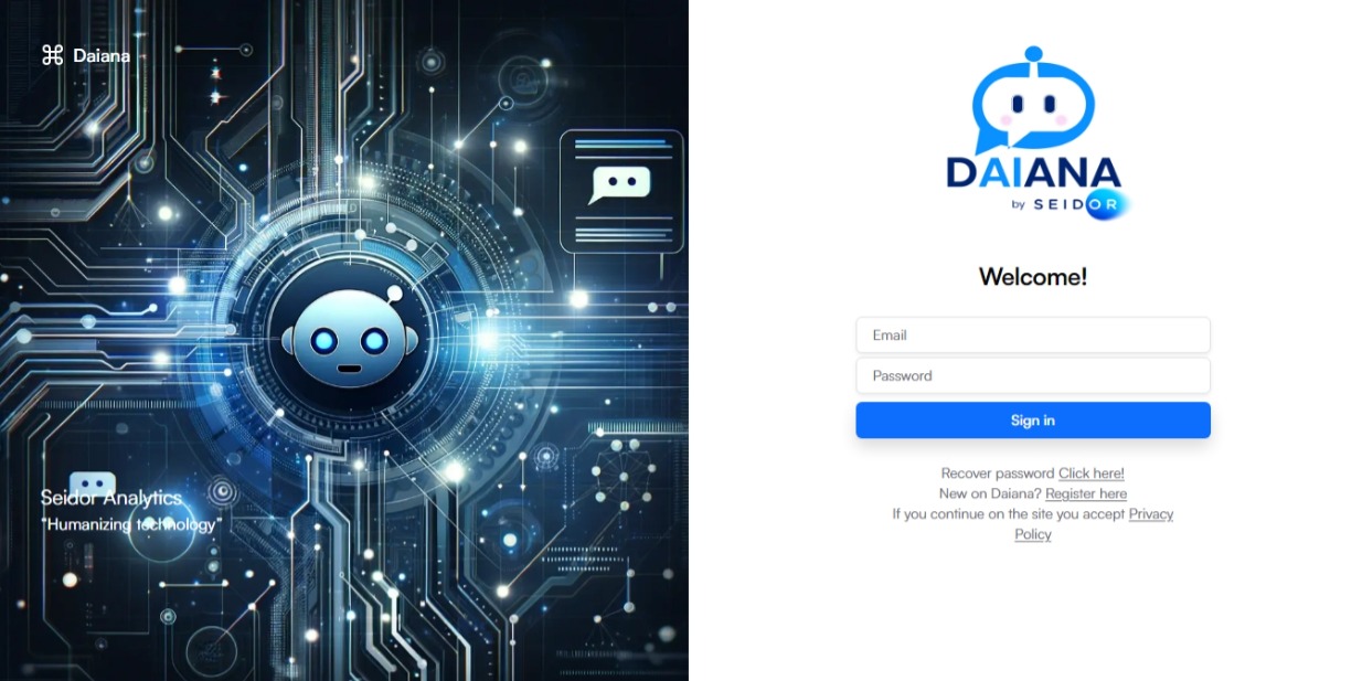 Esta pantalla corresponde a la interfaz de inicio de sesión de la plataforma Daiana by Seidor Analytics. Aquí los usuarios pueden ingresar sus credenciales para acceder al sistema. La pantalla está dividida en dos secciones principales: una imagen a la izquierda y el formulario de inicio de sesión a la derecha.